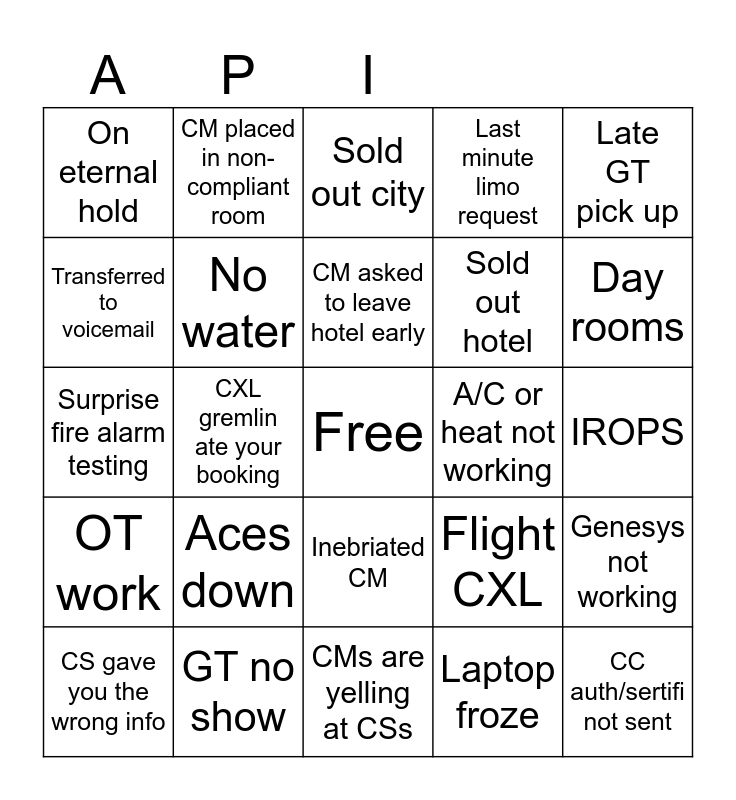 This bingo card has a free space and 24 words: Aces down, GT no show, CM asked to leave hotel early, CS gave you the wrong info, Late GT pick up, On eternal hold, Transferred to voicemail, CM placed in non-compliant room, A/C or heat not working, Inebriated CM, Sold out hotel, Surprise fire alarm testing, Flight CXL, Genesys not working, No water, Laptop froze, IROPS, Sold out city, Day rooms, CXL gremlin ate your booking, CC auth/sertifi not sent, OT work, Last minute limo request and CMs are yelling at CSs.