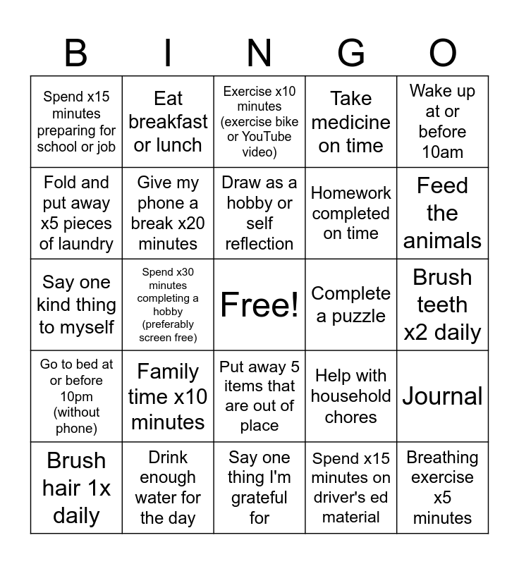 This bingo card has a free space and 24 words: Brush hair 1x daily, Family time x10 minutes, Draw as a hobby or self reflection, Spend x15 minutes on driver's ed material, Wake up at or before 10am, Spend x15 minutes preparing for school or job, Eat breakfast or lunch, Exercise x10 minutes (exercise bike or YouTube video), Complete a puzzle, Brush teeth x2 daily, Say one kind thing to myself, Give my phone a break x20 minutes, Help with household chores, Journal, Fold and put away x5 pieces of laundry, Drink enough water for the day, Say one thing I'm grateful for, Take medicine on time, Feed the animals, Go to bed at or before 10pm (without phone), Spend x30 minutes completing a hobby (preferably screen free), Put away 5 items that are out of place, Homework completed on time and Breathing exercise x5 minutes.