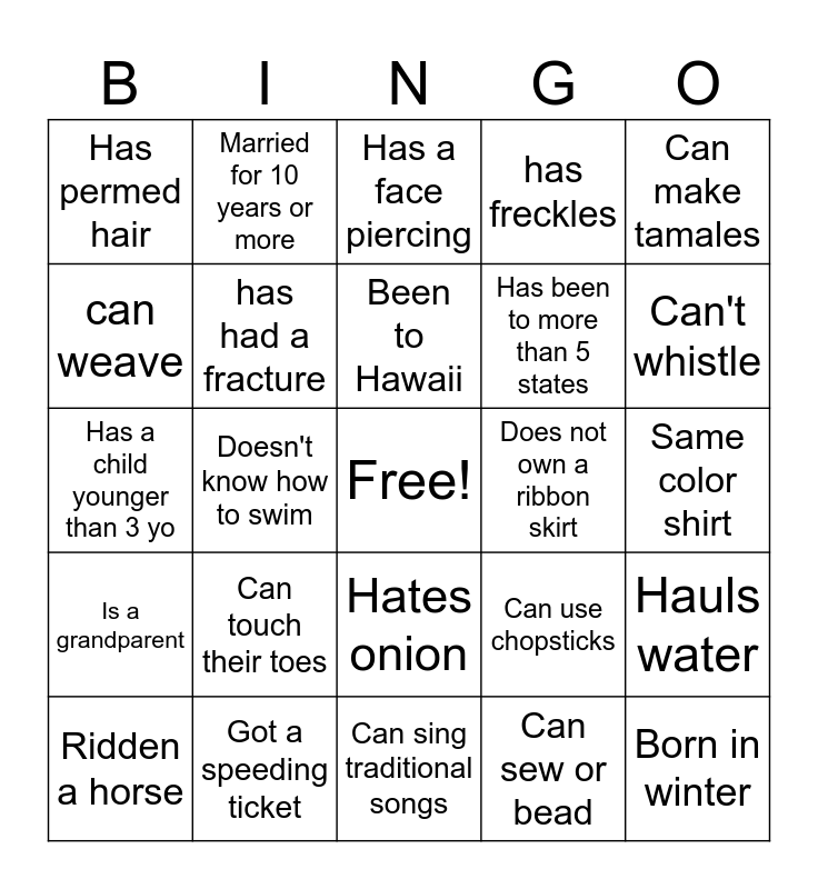 This bingo card has a free space and 25 words: Is a grandparent, Got a speeding ticket, Can sing traditional songs, Can sew or bead, Can make tamales, Has permed hair, Married for 10 years or more, Has a face piercing, Does not own a ribbon skirt, Hauls water, can weave, has had a fracture, Dislikes seafood, Can use chopsticks, Can't whistle, Ridden a horse, Doesn't know how to swim, Been to Hawaii, Has been to more than 5 states, Same color shirt, Has a child younger than 3 yo, Can touch their toes, Hates onion, has freckles and Born in winter.