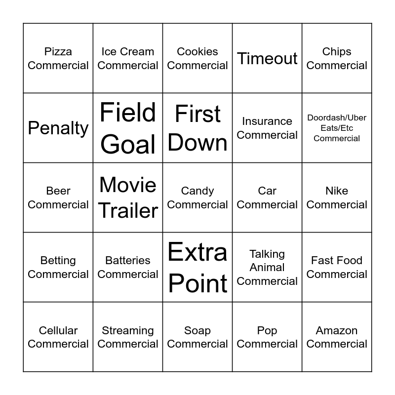 This bingo card has 35 words: Fumble, Interception, Touchdown, Field Goal, Extra Point, Timeout, Penalty, Punt, First Down, Sack, Beer Commercial, Chips Commercial, Hotel Commercial, Tax Commercial, Pizza Commercial, Car Commercial, Pop Commercial, Movie Trailer, Betting Commercial, Candy Commercial, Talking Animal Commercial, Cellular Commercial, Fast Food Commercial, Streaming Commercial, Cookies Commercial, Doordash/Uber Eats/Etc Commercial, Amazon Commercial, Apple Commercial, Insurance Commercial, Nike Commercial, Adidas Commercial, Soap Commercial, Batteries Commercial, Ice Cream Commercial and Coffee Commercial.