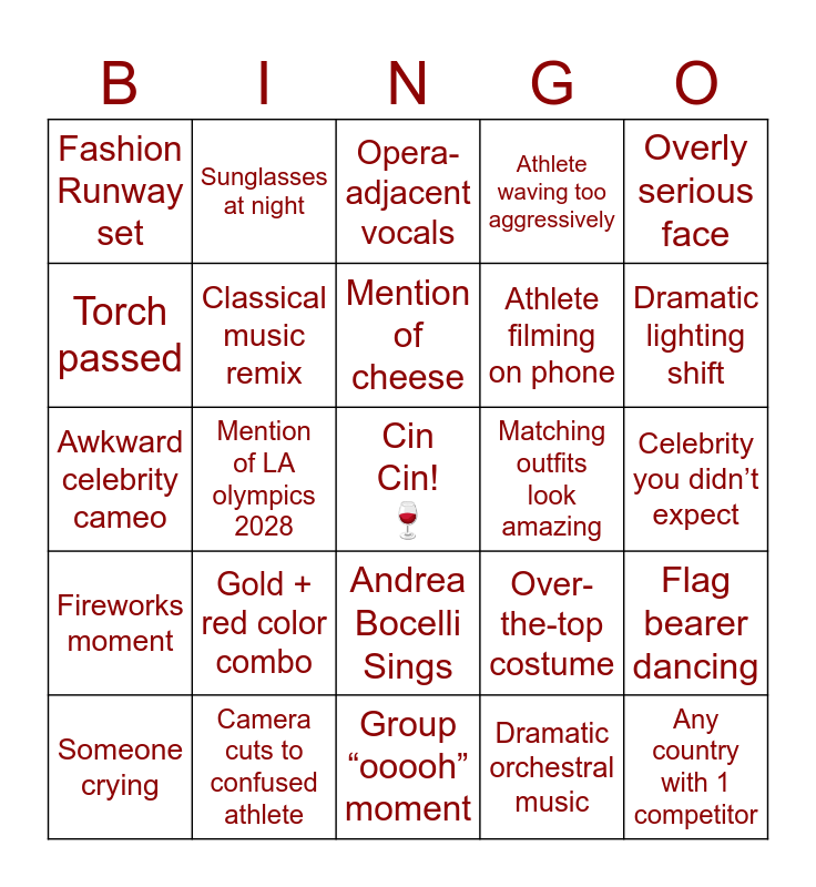 This bingo card has a free space and 28 words: Flag bearer dancing, Roman / classical imagery, Athlete filming on phone, Dramatic orchestral music, Torch passed, Opera-adjacent vocals, Sunglasses at night, Fireworks moment, Matching outfits look amazing, Someone crying, Awkward celebrity cameo, Athlete waving too aggressively, Camera cuts to confused athlete, Group “ooooh” moment, Dramatic lighting shift, Flag bearer trips (almost), Gold + red color combo, Classical music remix, Mention of cheese, Andrea Bocelli Sings, Fashion Runway set, Pizza sighting, Any country with 1 competitor, Mention of LA olympics 2028, Celebrity you didn’t expect, Over-the-top costume, Overly serious face and National anthem moment.