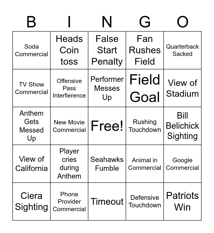This bingo card has a free space and 50 words: Seahawks Win, Patriots Win, Cardi B Sighting, Timeout, Player cries during Anthem, Tails Coin toss, Heads Coin toss, Wardrobe Malfunction, TV Show Commercial, Bud Light Commercial, Offensive Pass Interfierence, Fan Rushes Field, Google Commercial, Animal in Commercial, Coors Light Commercial, Challenged Play, Performer Messes Up, Rushing Touchdown, Interception, Quarterback Sacked, New Movie Commercial, Defensive Touchdown, Soda Commercial, Field Goal, Blocked Field Goal, Overtime, View of Stadium, Fake Punt, False Start Penalty, Seahawks Fumble, Patriots Fumble, Defensive Holding, Game Delay, Disney Commercial, Phone Provider Commercial, Insurance Commercial, First Quarter Total Odd, First Quarter Total Even, Tom Brady Sighting, Bill Belichick Sighting, Russell Wilson Sighting, Flag on Play, Richard Sherman Sighing, Stefon Diggs Close Up, Ciera Sighting, Anthem Gets Messed Up, Alix Earle Sighting, Alexa Commercial, View of California and Miller Commercial.