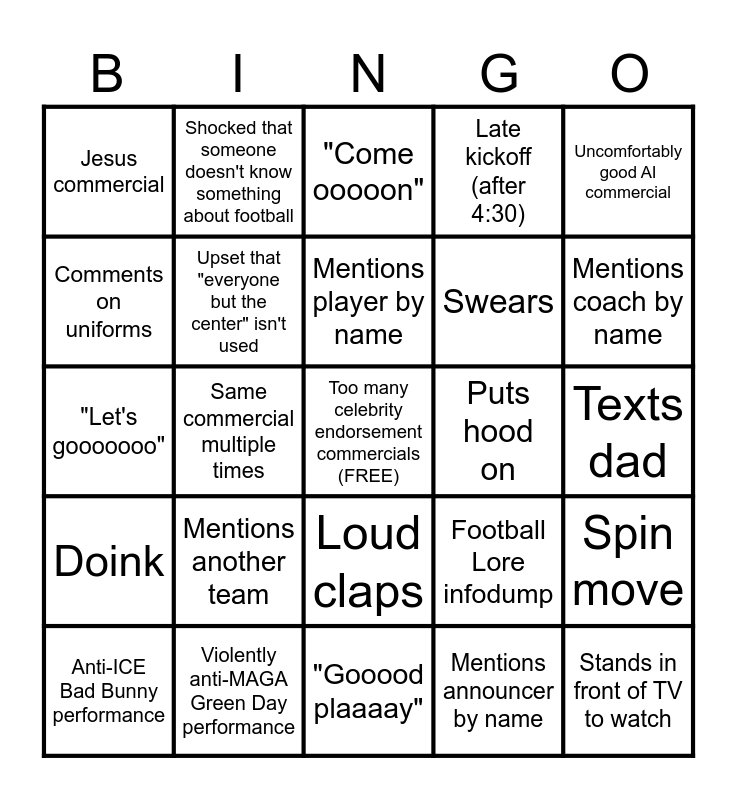 This bingo card has a free space and 24 words: Mentions another team, Violently anti-MAGA Green Day performance, Mentions player by name, Anti-ICE Bad Bunny performance, Uncomfortably good AI commercial, Jesus commercial, Comments on uniforms, Shocked that someone doesn't know something about football, Puts hood on, Loud claps, Swears, "Let's gooooooo", Football Lore infodump, Spin move, Upset that "everyone but the center" isn't used, Mentions announcer by name, Texts dad, "Come ooooon", Mentions coach by name, Same commercial multiple times, Stands in front of TV to watch, Doink, Late kickoff (after 4:30) and "Gooood plaaaay".