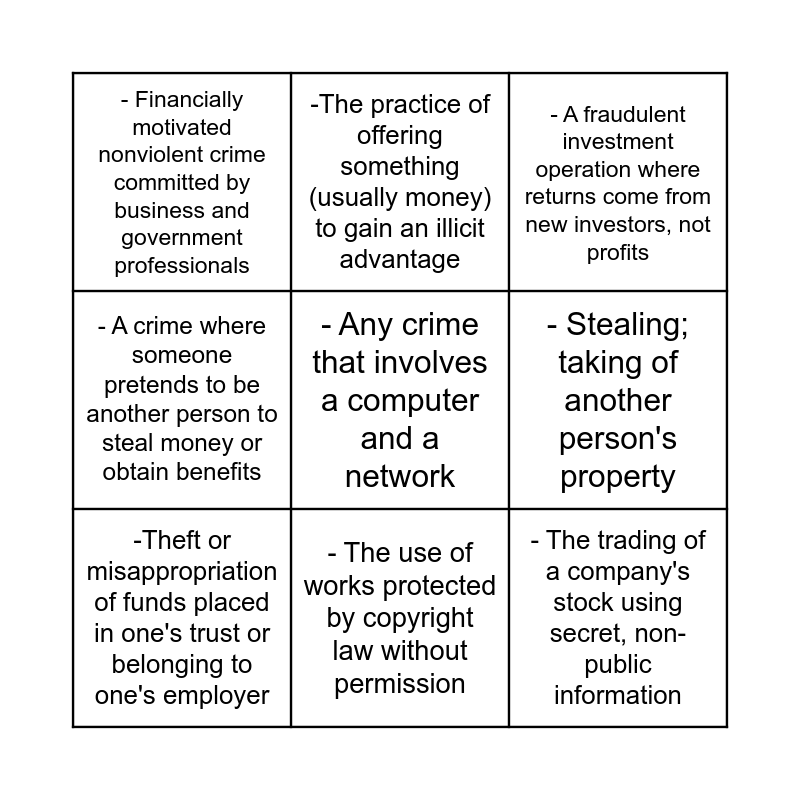 This bingo card has 14 words: -A deception deliberately practiced to secure unfair or unlawful gain, -Made in the image of something real; not genuine; a fake item used to deceive, -Theft or misappropriation of funds placed in one's trust or belonging to one's employer, -The practice of offering something (usually money) to gain an illicit advantage, - A crime where someone pretends to be another person to steal money or obtain benefits, - Any crime that involves a computer and a network, - The trading of a company's stock using secret, non-public information, - Engaging in financial transactions to conceal the source of illegally gained funds, - The use of works protected by copyright law without permission, - Financially motivated nonviolent crime committed by business and government professionals, - The process of making fake documents with the intent to deceive, - Stealing; taking of another person's property, - A fraudulent investment operation where returns come from new investors, not profits and - Falsification of financial information by insiders to inflate profits.