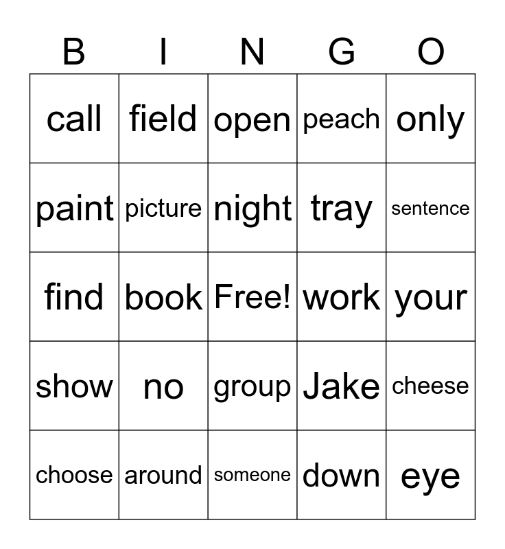 This bingo card has a free space and 29 words: choose, also, book, me, call, open, picture, no, work, around, your, eye, someone, down, sentence, paper, group, show, only, find, Jake, complain, tray, paint, peach, field, cheese, night and shine.