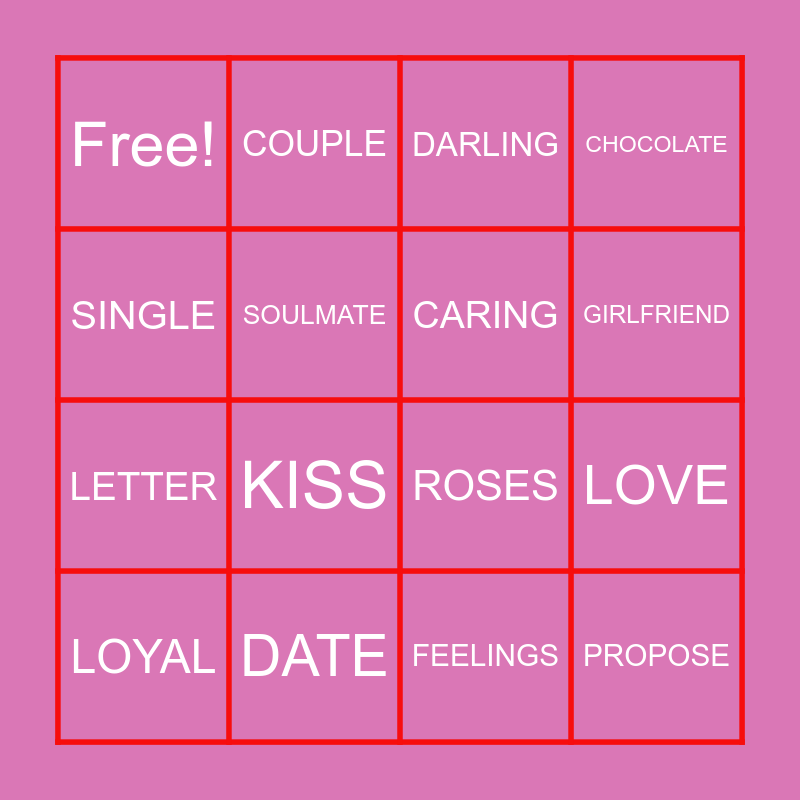 This bingo card has 40 words: CRUSH, SOULMATE, FLIRT, PROPOSE, LOYAL, HEARTBREAK, CARING, JEALOUS, Free!, DATE, ROMANCE, GIRLFRIEND, SINGLE, KISS, HUG, PARTNER, PASSIONATE, COUPLE, RING, CHOCOLATE, LETTER, HEART, ROSES, LOVE, SWEET, RELATIONSHIP, FRIENDSHIP, KINDNESS, POEM, FLOWERS, BREAKUP, ENGAGEMENT, AFFECTION, EMOTION, FEELINGS, BOYFRIEND, CUTE, BOND, DARLING and VALENTINE.