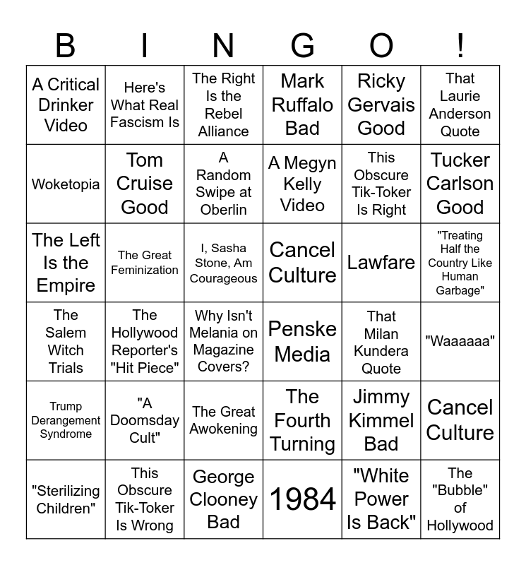 This bingo card has 36 words: The Fourth Turning, The Great Awokening, 1984, Woketopia, The Salem Witch Trials, Cancel Culture, Tom Cruise Good, George Clooney Bad, Ricky Gervais Good, Jimmy Kimmel Bad, Tucker Carlson Good, Mark Ruffalo Bad, Cancel Culture, The Great Feminization, A Megyn Kelly Video, A Critical Drinker Video, Trump Derangement Syndrome, Lawfare, The Left Is the Empire, The Right Is the Rebel Alliance, I, Sasha Stone, Am Courageous, The Hollywood Reporter's "Hit Piece", Penske Media, Why Isn't Melania on Magazine Covers?, That Milan Kundera Quote, Here's What Real Fascism Is, This Obscure Tik-Toker Is Right, This Obscure Tik-Toker Is Wrong, A Random Swipe at Oberlin, That Laurie Anderson Quote, The "Bubble" of Hollywood, "Sterilizing Children", "Waaaaaa", "Treating Half the Country Like Human Garbage", "A Doomsday Cult" and "White Power Is Back".