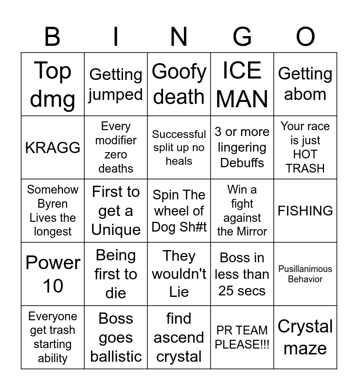 This bingo card has a free space and 24 words: Being first to die, Boss goes ballistic, Successful split up no heals, Everyone get trash starting ability, Getting abom, Top dmg, KRAGG, Getting jumped, Win a fight against the Mirror, They wouldn't Lie, 3 or more lingering Debuffs, Somehow Byren Lives the longest, Boss in less than 25 secs, Pusillanimous Behavior, Every modifier zero deaths, PR TEAM PLEASE!!!, FISHING, Goofy death, Your race is just HOT TRASH, First to get a Unique, Crystal maze, Power 10, ICE MAN and find ascend crystal.