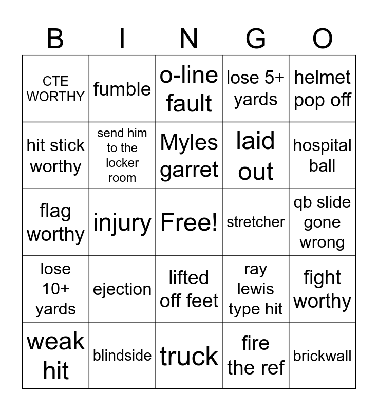 This bingo card has a free space and 24 words: ejection, blindside, Myles garret, weak hit, helmet pop off, CTE WORTHY, hit stick worthy, fumble, stretcher, lifted off feet, laid out, flag worthy, ray lewis type hit, fight worthy, send him to the locker room, fire the ref, qb slide gone wrong, o-line fault, hospital ball, injury, brickwall, lose 10+ yards, lose 5+ yards and truck.