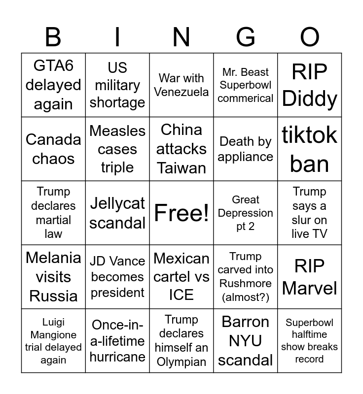 This bingo card has a free space and 24 words: JD Vance becomes president, Once-in-a-lifetime hurricane, China attacks Taiwan, Luigi Mangione trial delayed again, RIP Diddy, GTA6 delayed again, Canada chaos, US military shortage, Great Depression pt 2, Mexican cartel vs ICE, Death by appliance, Trump declares martial law, Trump carved into Rushmore (almost?), RIP Marvel, Measles cases triple, Barron NYU scandal, Trump says a slur on live TV, War with Venezuela, tiktok ban, Jellycat scandal, Superbowl halftime show breaks record, Melania visits Russia, Mr. Beast Superbowl commerical and Trump declares himself an Olympian.