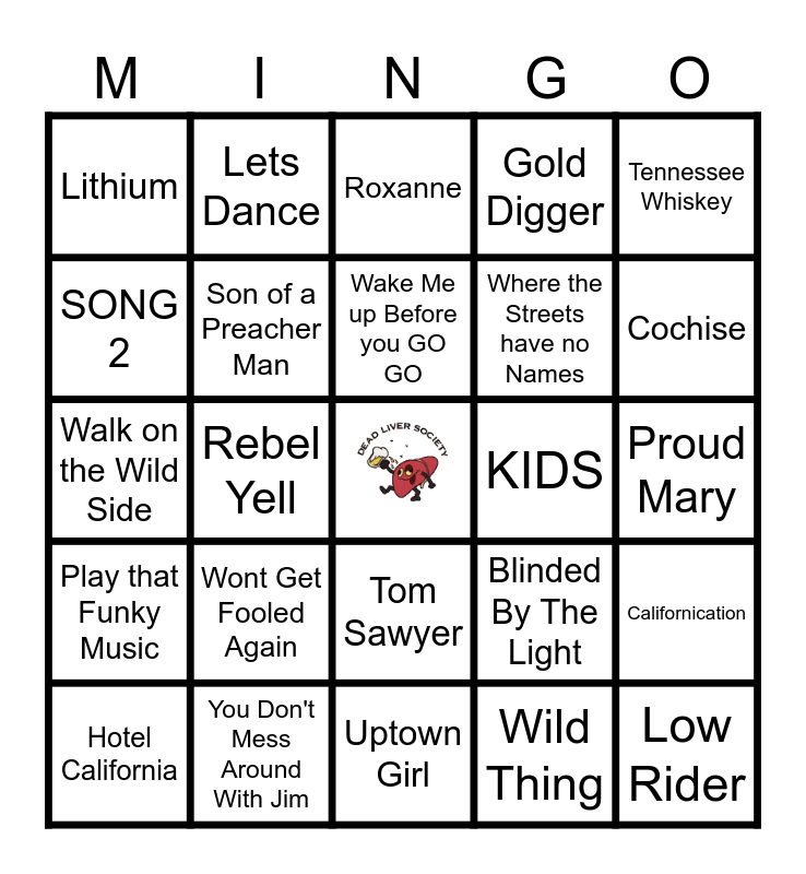 This bingo card has a free space and 25 words: Wont Get Fooled Again, Uptown Girl, Wake Me up Before you GO GO, Hotel California, Tennessee Whiskey, Lithium, SONG 2, Lets Dance, KIDS, Tom Sawyer, Where the Streets have no Names, Walk on the Wild Side, Blinded By The Light, Californication, Son of a Preacher Man, Take Me Out, Proud Mary, Roxanne, Cochise, Rebel Yell, Low Rider, You Don't Mess Around With Jim, Play that Funky Music, Gold Digger and Wild Thing.