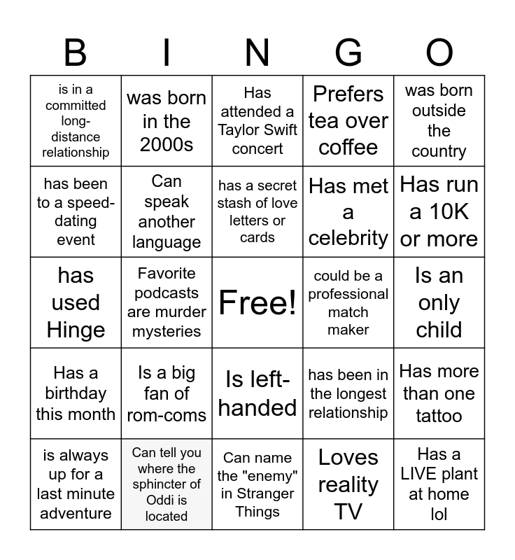 This bingo card has a free space and 24 words: Is a big fan of rom-coms, Can tell you where the sphincter of Oddi is located, has a secret stash of love letters or cards, is always up for a last minute adventure, was born outside the country, is in a committed long-distance relationship, has been to a speed-dating event, was born in the 2000s, could be a professional match maker, Is left-handed, Has met a celebrity, has used Hinge, has been in the longest relationship, Has more than one tattoo, Can speak another language, Loves reality TV, Is an only child, Has attended a Taylor Swift concert, Has run a 10K or more, Favorite podcasts are murder mysteries, Has a LIVE plant at home lol, Has a birthday this month, Prefers tea over coffee and Can name the "enemy" in Stranger Things.