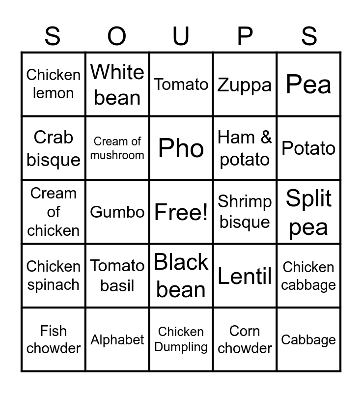 This bingo card has a free space and 75 words: Chicken noodle, Miso, Tomato, Chicken & rice, Broccoli cheddar, French onion, Clam chowder, Chicken tortilla, Wonton, Egg drop, Hot and sour, Ramen, Pho, Crab bisque, Lobster bisque, Gumbo, Jambalaya, Cabbage, Leek & potato, Pea, Pumpkin, Cream of chicken, Cream of mushroom, White bean, Zuppa, Beer cheese, Taco, Lasagna, Coconut curry, Coconut lime, Bone broth, Chili, White chicken chili, Lentil, Potato, Ham & potato, Beef & vegetable, Ham & bean, Split pea, Corn chowder, Cream of celery, Chicken vegetable, Carrot, Italian wedding, Butternut squash, Goulash, Fish chowder, Chicken lemon, Beef soup, Manhattan clam chowder, Cream of potato, Black bean, Tortellini, Chicken & stars, Cheeseburger, Scotch broth, Navy bean, Chickpea, Red lentil, Sweet potato, Tomato basil, Cream of onion, Oyster stew, Seafood bisque, Cream of asparagus, Shrimp bisque, Vegetable beef, Turkey rice, Loaded baked potato, Chicken cabbage, Chicken spinach, Alphabet, Free, Chicken Dumpling and Beef barley.