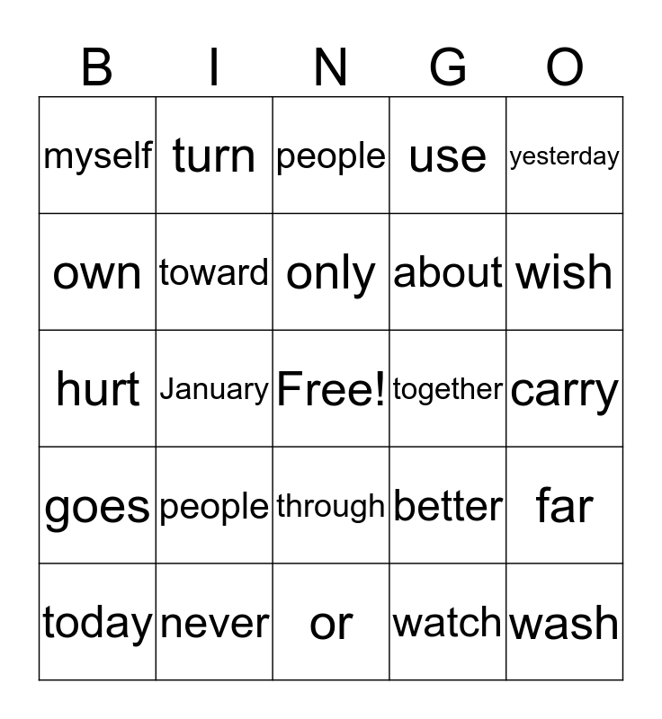 This bingo card has a free space and 24 words: people, never, only, today, yesterday, myself, own, turn, together, through, about, hurt, better, far, toward, watch, carry, people, wish, January, wash, goes, use and or.