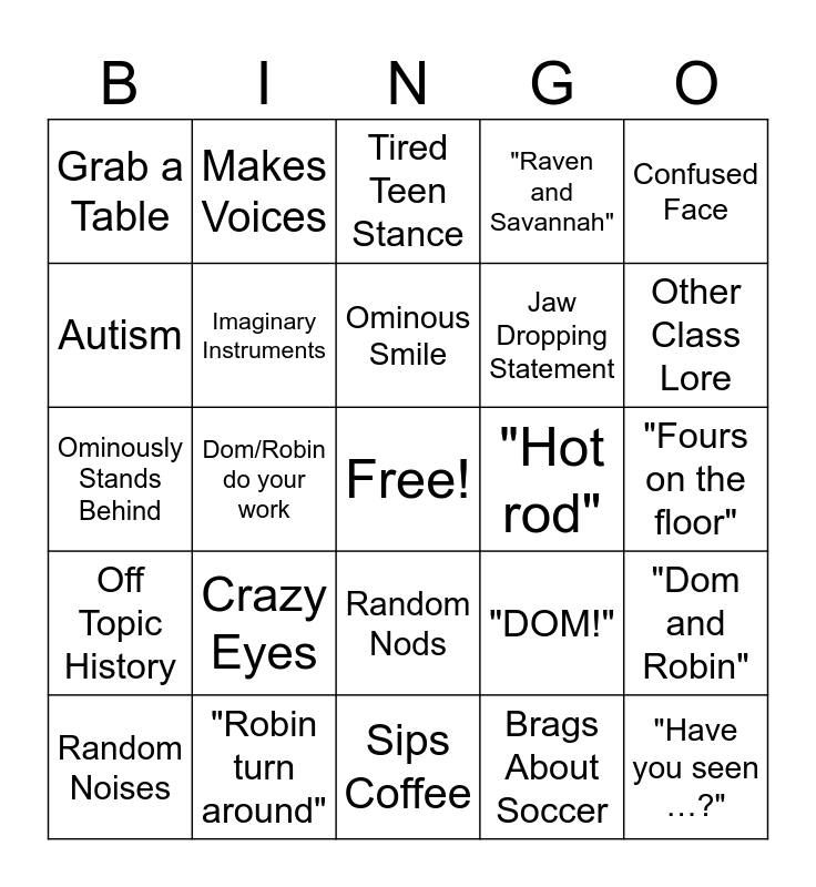This bingo card has a free space and 48 words: Moves Computers, "Have you seen …?", References Music, Sips Coffee, Crazy Eyes, Chews Gum With Mouth Open, Makes Voices, Bends Over, Autism, Knocks on Table, Imaginary Instruments, "Raven and Savannah", "Dom and Robin", "DOM!", "Dom, Robin, turn around", Asks About Food/Drink, Ominous Smile, "Hot rod", Points At A Map, Confused Face, Dom/Robin do your work, Brags About Soccer, Grab a Table, Jaw Dropping Statement, Teenage Slang, Other Class Lore, Random Noises, Weird Face, Random Nods, Off Topic History, "Croc Mode", "Boom", Country Accent, Talks About Sports, "Robin turn around", "Alll right!", "HEY…", "Fours on the floor", Singing, Wanders Room, Dinosaur? Sounds, Walks Outta Class, Tired Teen Stance, Dumb Jokes, Ominously Stands Behind, Taps Table, Knocks on Table and Steals Food.