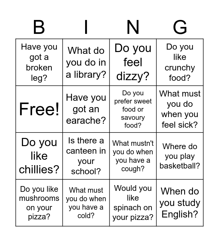 This bingo card has 16 words: What must you do when you have a cold?, Where do you play basketball?, Do you feel dizzy?, Have you got a broken leg?, Do you like chillies?, What do you do in a library?, What mustn't you do when you have a cough?, Would you like spinach on your pizza?, Free!, Have you got an earache?, Do you like mushrooms on your pizza?, Do you like crunchy food?, Is there a canteen in your school?, What must you do when you feel sick?, Do you prefer sweet food or savoury food? and When do you study English?.