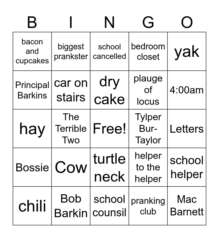 This bingo card has a free space and 53 words: Jory John, Mac Barnett, Yawnee Valley, pranking club, Cow, Counting Moo's, biggest prankster, pranking notebook, Principal Barkins, Power speech, car on stairs, go through the car, school helper, helper to the helper, Josh Barkin, chili, dry cake, Tylper Bur-Taylor, goat, yak, The Terrible Two, Two, plauge of locus, bacon and cupcakes, 5 generations, Bob Barkin, big mouth, April Fool's Day, 107, 4:00am, 1:00am, sabbatical, secret hideout, tree house, The 7 Principles of Principal Power, utility closet, bedroom closet, school counsil, school cancelled, pie catapult, Stuart, mayor, Letters, blizzard, rubber chicken, turtle neck, diorama, crickets, hay, Bossie, go down stairs, car and on fire and flooded.