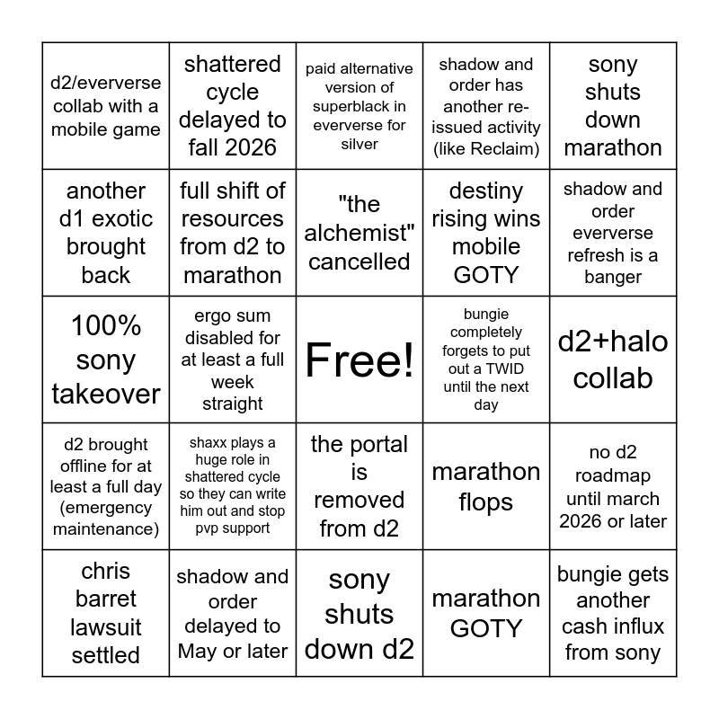 This bingo card has a free space and 24 words: shaxx plays a huge role in shattered cycle so they can write him out and stop pvp support, shadow and order delayed to May or later, "the alchemist" cancelled, chris barret lawsuit settled, sony shuts down marathon, d2/eververse collab with a mobile game, another d1 exotic brought back, shattered cycle delayed to fall 2026, bungie completely forgets to put out a TWID until the next day, the portal is removed from d2, destiny rising wins mobile GOTY, 100% sony takeover, marathon flops, no d2 roadmap until march 2026 or later, full shift of resources from d2 to marathon, marathon GOTY, d2+halo collab, paid alternative version of superblack in eververse for silver, shadow and order eververse refresh is a banger, ergo sum disabled for at least a full week straight, bungie gets another cash influx from sony, d2 brought offline for at least a full day (emergency maintenance), shadow and order has another re-issued activity (like Reclaim) and sony shuts down d2.