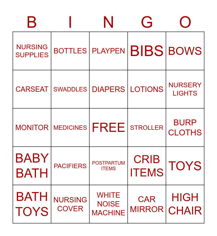 This bingo card has a free space and 28 words: TOYS, BOUNCER, LOTIONS, CAR MIRROR, CARSEAT, PLAYPEN, BOTTLES, BABY BATH, STROLLER, BATH TOYS, MONITOR, BIBS, NURSING COVER, WHITE NOISE MACHINE, NURSERY LIGHTS, DIAPER ORGANIZER, PACIFIERS, SWADDLES, DIAPERS, POSTPARTUM ITEMS, NURSING SUPPLIES, BABY WIPES, HIGH CHAIR, MEDICINES, BURP CLOTHS, CRIB ITEMS, BOWS and BOOKS.