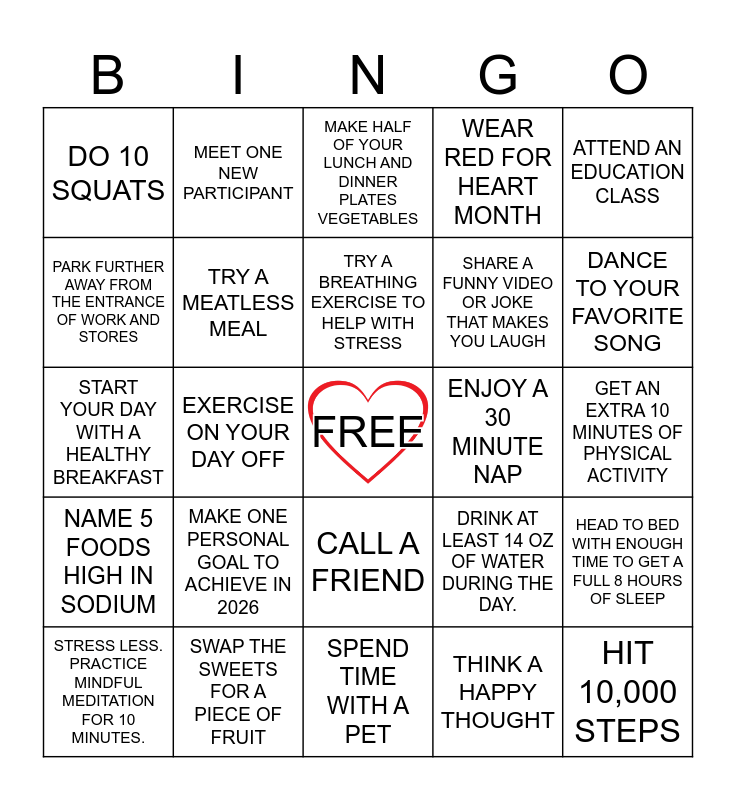 This bingo card has a free space and 26 words: CALL A FRIEND, THINK A HAPPY THOUGHT, TRY A BREATHING EXERCISE TO HELP WITH STRESS, SWAP THE SWEETS FOR A PIECE OF FRUIT, ATTEND AN EDUCATION CLASS, DO 10 SQUATS, PARK FURTHER AWAY FROM THE ENTRANCE OF WORK AND STORES, MEET ONE NEW PARTICIPANT, GET AN EXTRA 10 MINUTES OF PHYSICAL ACTIVITY, DRINK AT LEAST 14 OZ OF WATER DURING THE DAY., SHARE A FUNNY VIDEO OR JOKE THAT MAKES YOU LAUGH, START YOUR DAY WITH A HEALTHY BREAKFAST, HEAD TO BED WITH ENOUGH TIME TO GET A FULL 8 HOURS OF SLEEP, STRESS LESS. PRACTICE MINDFUL MEDITATION FOR 10 MINUTES., EXERCISE ON YOUR DAY OFF, 100% ATTENDANCE FOR THE WEEK, WEAR RED FOR HEART MONTH, NAME 5 FOODS HIGH IN SODIUM, MAKE HALF OF YOUR LUNCH AND DINNER PLATES VEGETABLES, HIT 10,000 STEPS, DANCE TO YOUR FAVORITE SONG, SPEND TIME WITH A PET, ENJOY A 30 MINUTE NAP, MAKE ONE PERSONAL GOAL TO ACHIEVE IN 2026, TRY A MEATLESS MEAL and PERFORM 5 MINUTES OF STRETCHING.