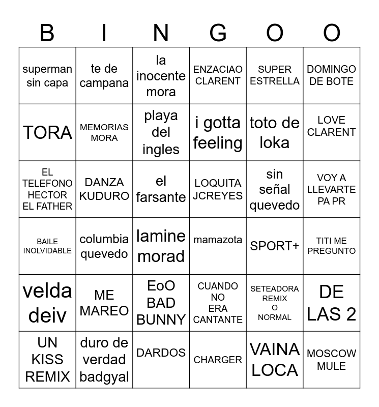 This bingo card has 36 words: CUANDO NO ERA CANTANTE, EoO BAD BUNNY, CHARGER, TORA, BAILE INOLVIDABLE, LOQUITA JCREYES, MEMORIAS MORA, DARDOS, SUPER ESTRELLA, SETEADORA REMIX O NORMAL, LOVE CLARENT, ENZACIAO CLARENT, DE LAS 2, DANZA KUDURO, i gotta feeling, superman sin capa, velda deiv, sin señal quevedo, EL TELEFONO HECTOR EL FATHER, la inocente mora, el farsante, columbia quevedo, mamazota, lamine morad, SPORT+, te de campana, toto de loka, duro de verdad badgyal, playa del ingles, DOMINGO DE BOTE, MOSCOW MULE, UN KISS REMIX, TITI ME PREGUNTO, VOY A LLEVARTE PA PR, ME MAREO and VAINA LOCA.