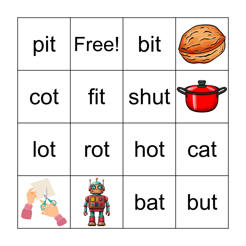 This bingo card has 6 images and 13 words: hot, hut, bit, but, cat, cot, bat, pit, Free!, lot, rot, fit and shut.