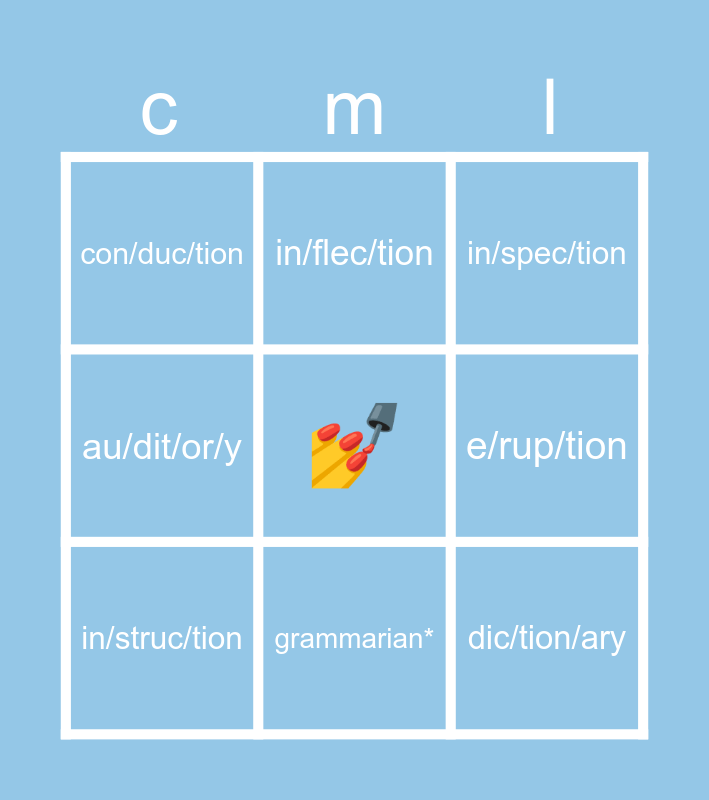 This bingo card has a free space and 8 words: e/rup/tion, in/spec/tion, in/flec/tion, in/struc/tion, con/duc/tion, dic/tion/ary, au/dit/or/y and grammarian*.