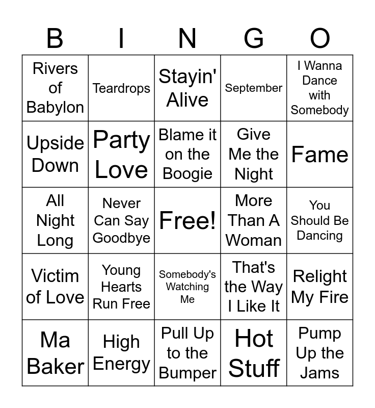 This bingo card has a free space and 76 words: Boogie Wonderland, Le Freak, Stayin' Alive, It's Raining Men, Daddy Cool, Celebration, Born to Be Alive, Dancing Queen, I'm so excited, Funky Town, Georgy Porgy, Gimme! Gimme! Gimme!, Blame it on the Boogie, Upside Down, Bruises, Never Can Say Goodbye, Let's Groove, Pump Up the Jams, Groove Move, I Wanna Dance with Somebody, Give it Up, All Night Long, Party Love, Teardrops, September, Ladies Night, I'm Every Woman, Can't Take My Eyes Off of You, YMCA, I Will Survive, Fresh, Disco Still Survive, Get Down Saturday Night, That's the Way I Like It, Fame, Give Me the Night, Just an Illusion, Disco Inferno, You Should Be Dancing, Hot Stuff, Last Dance, Get Down Tonight, Funkytown, Super Freak, Yes Sir, I Can Boogie, Take Me Up, Ma Baker, Rivers of Babylon, How Will I Know, Raspberry Beret, Don't Go, Somebody's Watching Me, I'm Coming Out, Night Fever, Car Wash, Got to Be Real, Stomp!, He's the Greatest Dancer, Rasputin, Ain't Nobody, Young Hearts Run Free, Best of My Love, I'm Your Boogie Man, Knock on Wood, Jump (For My Love), Smalltown Boy, More Than A Woman, Native New Yorker, Brick House, Pick Up the Pieces, Relight My Fire, Victim of Love, High Energy, Feels Like I'm in Love, Pull Up to the Bumper and I Am What I Am.