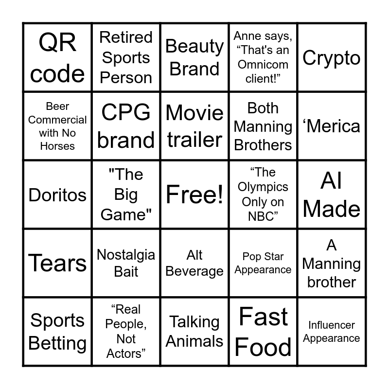 This bingo card has a free space and 24 words: Nostalgia Bait, “Real People, Not Actors”, Movie trailer, Sports Betting, Crypto, QR code, Beer Commercial with No Horses, Retired Sports Person, “The Olympics Only on NBC”, Alt Beverage, Both Manning Brothers, Doritos, Pop Star Appearance, A Manning brother, CPG brand, Fast Food, AI Made, Beauty Brand, ‘Merica, "The Big Game", Influencer Appearance, Tears, Anne says, “That's an Omnicom client!” and Talking Animals.