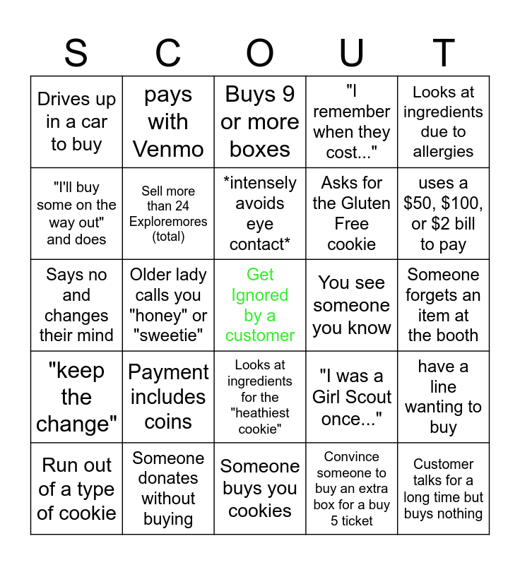 This bingo card has a free space and 27 words: "I was a Girl Scout once...", "These will be bad for my health" *buys anyway*, Asks for the Gluten Free cookie, Someone buys you cookies, "I'll buy some on the way out" and does, Buys 9 or more boxes, pays with Venmo, "keep the change", You see someone you know, have a line wanting to buy, Says no and changes their mind, "I remember when they cost...", Run out of a type of cookie, Someone donates without buying, uses a $50, $100, or $2 bill to pay, Is a girl scout and buys from your anyway, Sell more than 24 Exploremores (total), *intensely avoids eye contact*, Payment includes coins, Drives up in a car to buy, Someone forgets an item at the booth, Convince someone to buy an extra box for a buy 5 ticket, Older lady calls you "honey" or "sweetie", Customer talks for a long time but buys nothing, Looks at ingredients for the "heathiest cookie", Looks at ingredients due to allergies and Has a pet with them.
