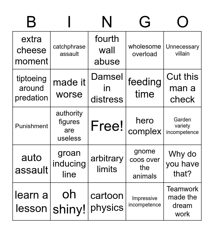 This bingo card has a free space and 27 words: gnome coos over the animals, babies!, feeding time, cartoon physics, tiptoeing around predation, fourth wall abuse, catchphrase assault, auto assault, hero complex, Why do you have that?, Punishment, wholesome overload, learn a lesson, oh shiny!, Cut this man a check, this was your fault, made it worse, Damsel in distress, groan inducing line, extra cheese moment, Garden variety incompetence, Impressive incompetence, authority figures are useless, Teamwork made the dream work, arbitrary limits, Unnecessary villain and Petty disagreement.