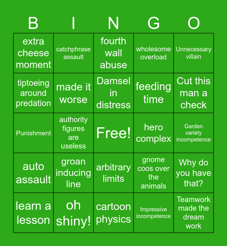 This bingo card has a free space and 27 words: gnome coos over the animals, babies!, feeding time, cartoon physics, tiptoeing around predation, fourth wall abuse, catchphrase assault, auto assault, hero complex, Why do you have that?, Punishment, wholesome overload, learn a lesson, oh shiny!, Cut this man a check, this was your fault, made it worse, Damsel in distress, groan inducing line, extra cheese moment, Garden variety incompetence, Impressive incompetence, authority figures are useless, Teamwork made the dream work, arbitrary limits, Unnecessary villain and Petty disagreement.