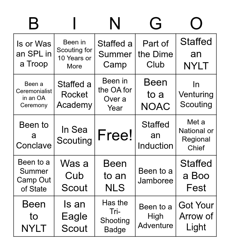 This bingo card has a free space and 24 words: Was a Cub Scout, Is an Eagle Scout, Been in the OA for Over a Year, Been to NYLT, Staffed an NYLT, Is or Was an SPL in a Troop, Been a Ceremonialist in an OA Ceremony, Been in Scouting for 10 Years or More, Staffed an Induction, Been to an NLS, Been to a NOAC, Been to a Conclave, Been to a Jamboree, Staffed a Boo Fest, Staffed a Rocket Academy, Been to a High Adventure, Met a National or Regional Chief, Staffed a Summer Camp, In Venturing Scouting, In Sea Scouting, Got Your Arrow of Light, Been to a Summer Camp Out of State, Part of the Dime Club and Has the Tri-Shooting Badge.