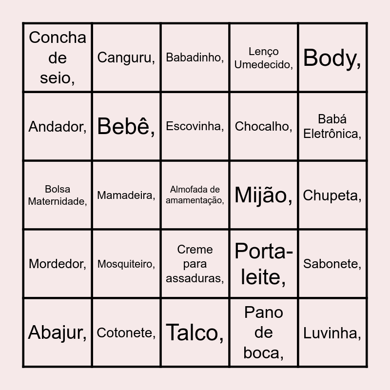 This bingo card has 61 words: Free!, Abajur,, Algodão,, Almofada de amamentação,, Álcool 70%,, Amor,, Andador,, Aspirador nasal,, Babadinho,, Babador,, Babá Eletrônica,, Banheira,, Bebê,, Bebê Conforto,, Berço,, Body,, Bolsa Maternidade,, Canguru,, Carrinho,, Chocalho,, Chupeta,, Concha de seio,, Cotonete,, Creme para assaduras,, Cueiro,, Cômoda,, Enxoval,, Escorredor de mamadeira,, Escovinha,, Esponja,, Faixinha,, Farmacinha,, Fralda,, Leite,, Lenço Umedecido,, Luvinha,, Macacão,, Mamadeira,, Meia,, Mijão,, Móbile,, Mordedor,, Mosquiteiro,, Naninha,, Pano de boca,, Papeiro,, Pente,, Poltrona,, Pomada,, Porta-leite,, Sabonete,, Sapatinho,, Shampoo,, Talco,, Termômetro,, Tesoura de unha,, Toalha de banho,, Touca,, Trocador,, Vovó Coruja, and Óleo de bebê,.