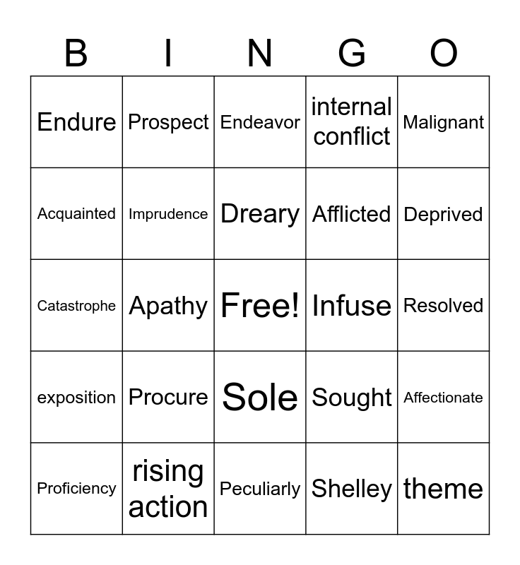 This bingo card has a free space and 25 words: Procure, Peculiarly, Dreary, Proficiency, Malignant, Endure, Acquainted, Prospect, Infuse, Sole, Afflicted, Catastrophe, Sought, Affectionate, Imprudence, Ascend, Resolved, Endeavor, Deprived, Apathy, theme, rising action, exposition, internal conflict and Shelley.