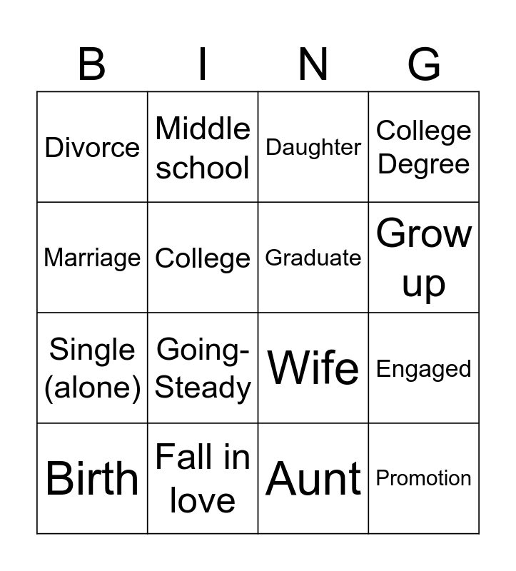 This bingo card has 49 words: Free!, Birth, Baby, Residential school, Mainstream school, Elementary school, Middle school, High school, College, University, Graduate, College Degree, Freshman, Sophomore, Junior, Senior, Grow up, Fall in love, Together, Marriage, Engaged, Wedding, Divorce, Single (alone), Pregnant, Going-Steady, Travel, Job offer, Move away, Promotion, Car crash, Retirement, Settle down, Death, Lay off, Fired, Lost, Sickness, Aunt, Uncle, Cousin, Niece, Nephew, Husband, Wife, Daughter, Son, Since and Time-Passing(later on).