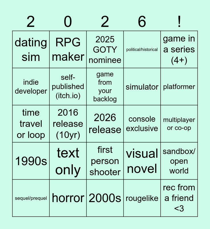 This bingo card has a free space and 24 words: text only, horror, game from your backlog, sequel/prequel, game in a series (4+), dating sim, indie developer, RPG maker, console exclusive, first person shooter, simulator, time travel or loop, visual novel, sandbox/ open world, self-published (itch.io), rougelike, multiplayer or co-op, 2025 GOTY nominee, platformer, 2016 release (10yr), rec from a friend <3, 1990s, political/historical and 2000s.