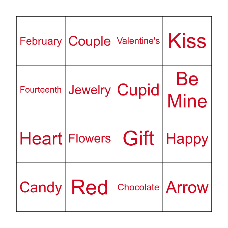 This bingo card has 21 words: Red, Love, Couple, Roses, Chocolate, Cupid, February, Valentine's, Gift, Be Mine, Heart, Kiss, Arrow, Card, Jewelry, Sweetheart, Candy, Flowers, Fourteenth, Happy and Date.