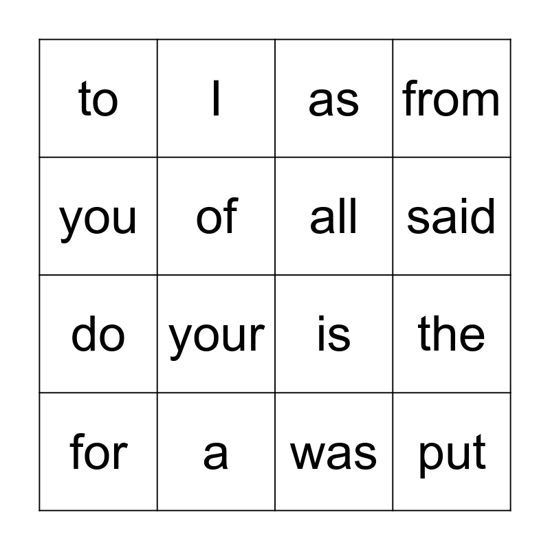 This bingo card has 16 words: a, the, as, to, do, I, is, was, you, of, for, from, your, said, all and put.