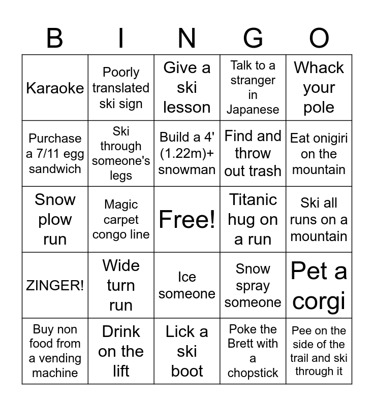This bingo card has a free space and 28 words: Pet a corgi, Get slapped by a muscle mommy at a muscle mommy bar, Find and throw out trash, Poke the Brett with a chopstick, Purchase a 7/11 egg sandwich, Give a ski lesson, Poorly translated ski sign, ZINGER!, Titanic hug on a run, Buy non food from a vending machine, Snow plow run, Talk to a stranger in Japanese, Drink on the lift, Lick a ski boot, Eat onigiri on the mountain, Win stuffed animal in claw game, Wide turn run, Ski through someone's legs, Build a 4' (1.22m)+ snowman, Ice someone, Karaoke, Prove that Loveland Pass is open, Pee on the side of the trail and ski through it, Magic carpet congo line, Ski all runs on a mountain, Snow spray someone, Whack your pole and Chinese downhill.