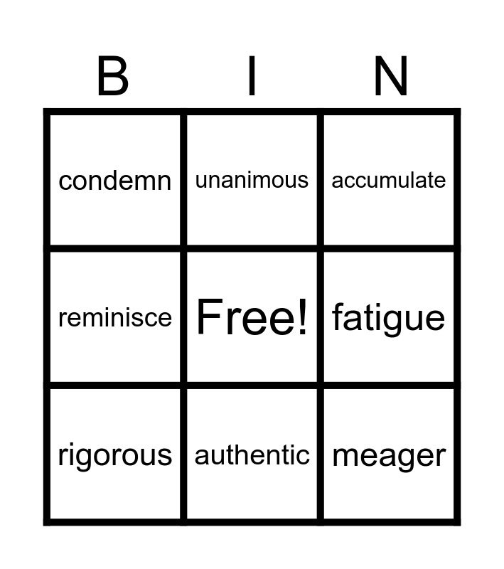 This bingo card has a free space and 11 words: abundant, authentic, meager, rigorous, unanimous, accumulate, fatigue, persevere, reminisce, condemn and deteriorate.