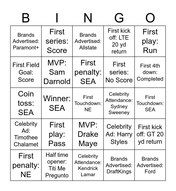 This bingo card has 30 words: Half time opener: Titi Me Pregunto, Half time opener: BAILE INoLVIDABLE, Winner: SEA, Winner: NE, Brands Advertised: Paramont+, Brands Advertised: Allstate, MVP: Sam Darnold, MVP: Drake Maye, Celebrity Attendance: Sydney Sweeney, Celebrity Attendance: Kendrick Lamar, First Touchdown: SEA, First Touchdown: NE, Brands Advertised: DraftKings, Brands Advertised: Ford, First 4th down: Completed, First 4th down: Turnover, Celebrity Ad: Harry Styles, Celebrity Ad: Timothee Chalamet, First play: Pass, First play: Run, Coin toss: SEA, Coin toss: NE, First series: Score, First series: No Score, First Field Goal: Score, First kick off: LTE 20 yd return, First kick off: GT 20 yd return, First penalty: NE, First penalty: SEA and First Field Goal: No Score.