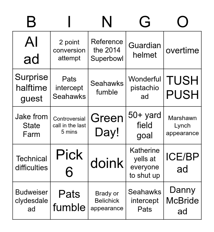 This bingo card has a free space and 24 words: Pick 6, Pats fumble, Seahawks fumble, Budweiser clydesdale ad, overtime, AI ad, Surprise halftime guest, 2 point conversion attempt, 50+ yard field goal, doink, Wonderful pistachio ad, Jake from State Farm, Katherine yells at everyone to shut up, ICE/BP ad, Pats intercept Seahawks, Seahawks intercept Pats, Marshawn Lynch appearance, Reference the 2014 Superbowl, TUSH PUSH, Controversial call in the last 5 mins, Danny McBride ad, Technical difficulties, Guardian helmet and Brady or Belichick appearance.