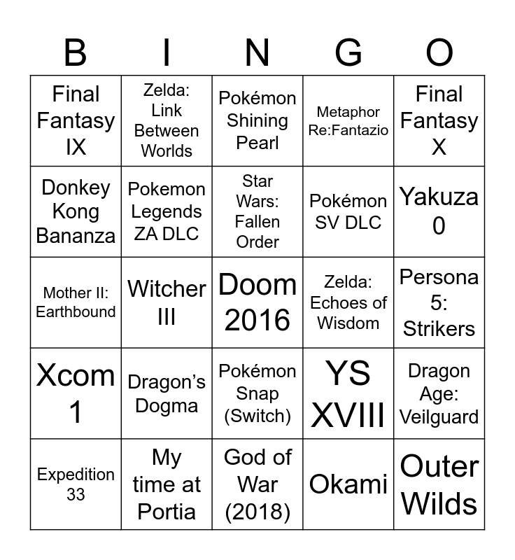 This bingo card has 25 words: Dragon’s Dogma, God of War (2018), Star Wars: Fallen Order, Expedition 33, Final Fantasy X, Final Fantasy IX, Donkey Kong Bananza, Zelda: Link Between Worlds, Zelda: Echoes of Wisdom, Pokémon Snap (Switch), Pokémon SV DLC, Mother II: Earthbound, YS XVIII, Dragon Age: Veilguard, Pokemon Legends ZA DLC, Outer Wilds, Persona 5: Strikers, Pokémon Shining Pearl, Yakuza 0, Witcher III, Doom 2016, My time at Portia, Xcom 1, Metaphor Re:Fantazio and Okami.