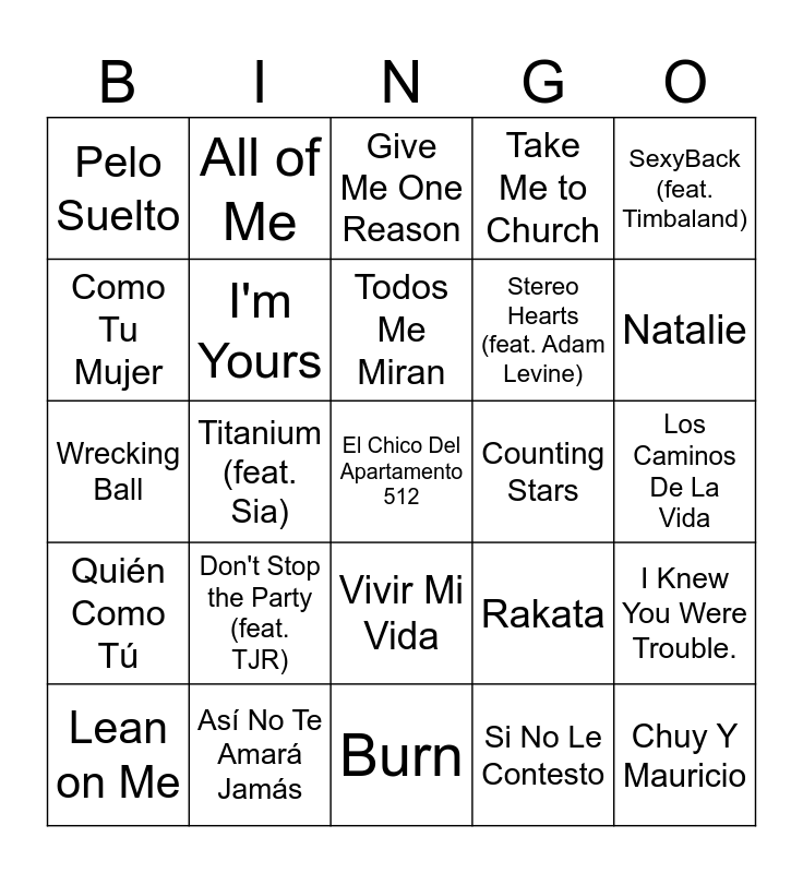 This bingo card has 104 words: Free!, Summertime Sadness, SexyBack (feat. Timbaland), In Da Club, Ms. New Booty, Stumblin' In, A Ram Sam Sam, Chuchuwa, Five Little Speckled Frogs, The Wheels On The Bus, PAM, Bingo, Ella Me Levantó, Si No Te Hubieras Ido, Borro Cassette, Hawái, Give Me One Reason, The Next Episode, Still D.R.E., Gangsta's Paradise, Regulate, No Diggity, Cake By The Ocean, Be the One, Wicked Games, Don't Stop the Party (feat. TJR), Natalie, Take Me to Church, Too Sweet, Abusadora, Rakata, Si No Le Contesto, La Chona, La Vaca, Quítame Ese Hombre Del Corazón -, La Noche Que Murio Chicago, El Gran Varon, Te Quedó Grande La Yegua, Todos Me Miran, Así No Te Amará Jamás, Dr. Psiquiatra, Quién Como Tú, Cómo Te Va Mi Amor, Como Tu Mujer, Asi Fue, Pelo Suelto, La Calle De Las Sirenas, El Chico Del Apartamento 512, Vuela, Vuela (Voyage, Voyage), Chuy Y Mauricio, Rebelión, La Puerta Negra, La Vida Es Un Carnaval, Rata De Dos Patas, Simplemente Amigos, A Dios Le Pido, El Color de Tus Ojos, Turn The Lights Off - Radio Edit, Como La Flor, Vivir Mi Vida, Los Caminos De La Vida, Oye Mujer, Tao, Tao, Pray, Two Wooden Beams, IN THE ROOM, La Fila, All of Me, Wrecking Ball, Titanium (feat. Sia), Burn, Last Friday Night (T.G.I.F.), Young And Beautiful, Talking to the Moon, Easy On Me, My Girl, Ain't No Mountain High Enough, Lean on Me, Isn't She Lovely, Diamonds, Empire State Of Mind, Where Is The Love?, I'm Yours, Hey, Soul Sister, Counting Stars, Save Your Tears, a thousand years, Macarena, Stand By Me, Hey There Delilah, Replay, Airplanes (feat. Hayley Williams of Paramore), Dynamite, I Knew You Were Trouble., Teenage Dream, Heart Attack, Whistle, Stereo Hearts (feat. Adam Levine), Beautiful Girls, Beauty And A Beat, Fireflies, Smack That, Crank That (Soulja Boy) and Listen To Your Heart.