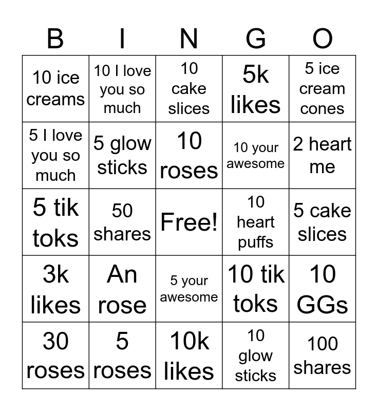 This bingo card has a free space and 24 words: An rose, 5 roses, 10 roses, 30 roses, 5 ice cream cones, 10 ice creams, 5 I love you so much, 10 I love you so much, 10 heart puffs, 5 your awesome, 10 your awesome, 5 tik toks, 10 tik toks, 10 GGs, 5 glow sticks, 10 glow sticks, 5 cake slices, 10 cake slices, 2 heart me, 50 shares, 100 shares, 3k likes, 5k likes and 10k likes.