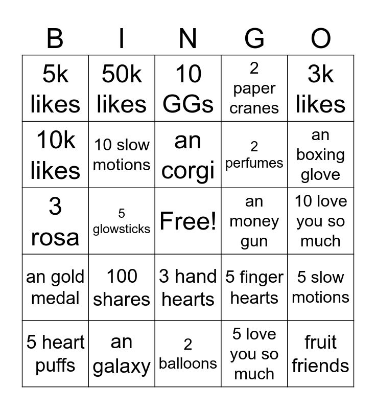 This bingo card has a free space and 24 words: 100 shares, an galaxy, an corgi, 5 heart puffs, 3k likes, 5k likes, 10k likes, 50k likes, an money gun, 3 hand hearts, 2 perfumes, 3 rosa, 5 finger hearts, 5 slow motions, 10 slow motions, 5 love you so much, 10 love you so much, 10 GGs, an boxing glove, 5 glowsticks, fruit friends, an gold medal, 2 paper cranes and 2 balloons.