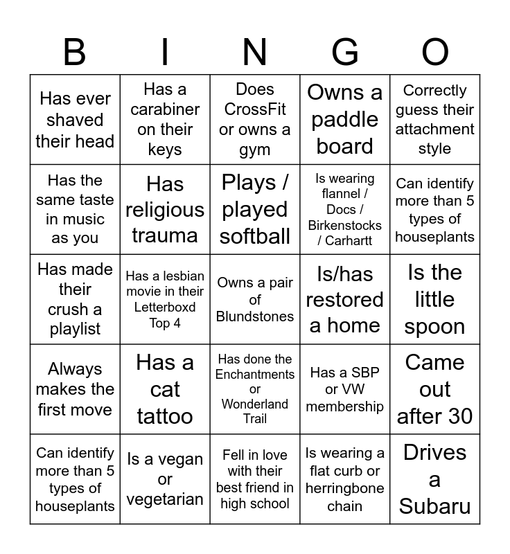 This bingo card has a free space and 24 words: Has a cat tattoo, Is a vegan or vegetarian, Plays / played softball, Can identify more than 5 types of houseplants, Correctly guess their attachment style, Has ever shaved their head, Has the same taste in music as you, Has a carabiner on their keys, Is/has restored a home, Has done the Enchantments or Wonderland Trail, Is wearing flannel / Docs / Birkenstocks / Carhartt, Has made their crush a playlist, Has a SBP or VW membership, Came out after 30, Has religious trauma, Is wearing a flat curb or herringbone chain, Is the little spoon, Does CrossFit or owns a gym, Can identify more than 5 types of houseplants, Has a lesbian movie in their Letterboxd Top 4, Drives a Subaru, Always makes the first move, Owns a paddle board and Fell in love with their best friend in high school.