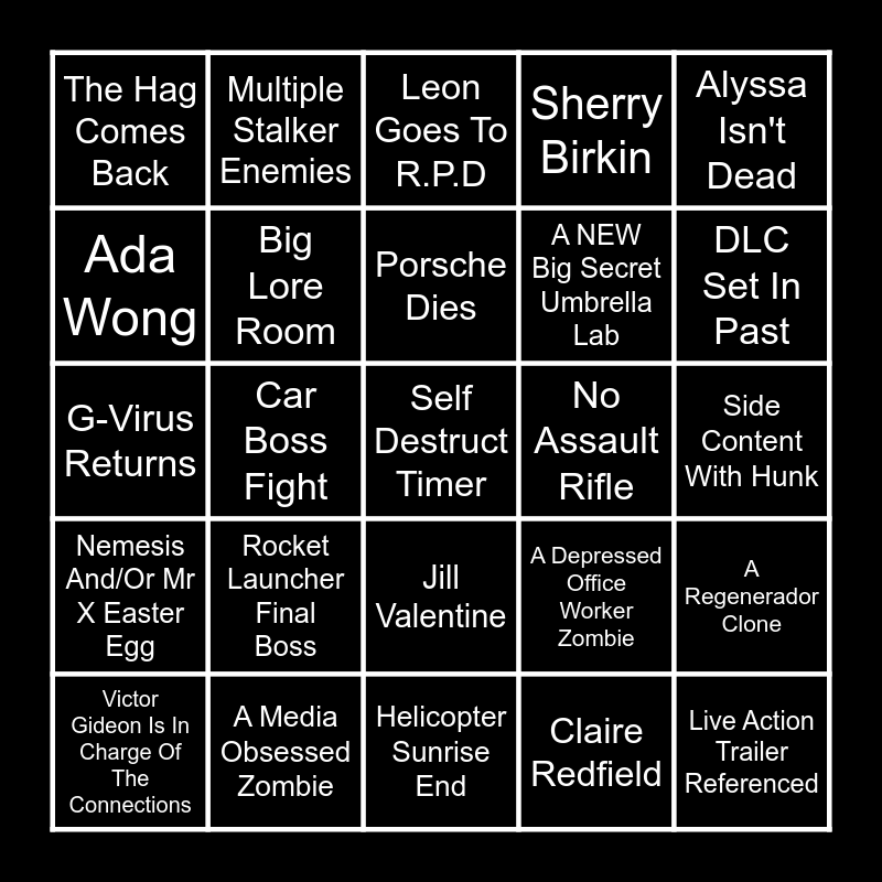 This bingo card has 25 words: Rocket Launcher Final Boss, Helicopter Sunrise End, Porsche Dies, Victor Gideon Is In Charge Of The Connections, Alyssa Isn't Dead, The Hag Comes Back, Ada Wong, Multiple Stalker Enemies, No Assault Rifle, Jill Valentine, A NEW Big Secret Umbrella Lab, G-Virus Returns, A Depressed Office Worker Zombie, A Regenerador Clone, Big Lore Room, Live Action Trailer Referenced, Side Content With Hunk, Leon Goes To R.P.D, DLC Set In Past, Car Boss Fight, Self Destruct Timer, A Media Obsessed Zombie, Nemesis And/Or Mr X Easter Egg, Sherry Birkin and Claire Redfield.