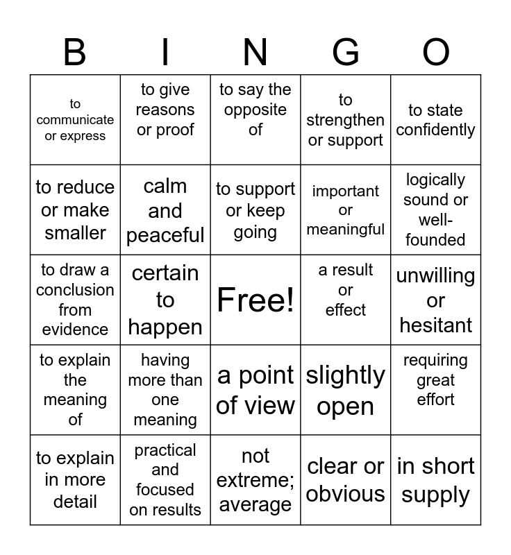 This bingo card has a free space and 24 words: having more than one meaning, practical and focused on results, to support or keep going, to explain in more detail, to state confidently, to communicate or express, to reduce or make smaller, to give reasons or proof, a result or effect, a point of view, important or meaningful, to draw a conclusion from evidence, slightly open, requiring great effort, calm and peaceful, clear or obvious, unwilling or hesitant, to say the opposite of, logically sound or well-founded, certain to happen, in short supply, to explain the meaning of, to strengthen or support and not extreme; average.